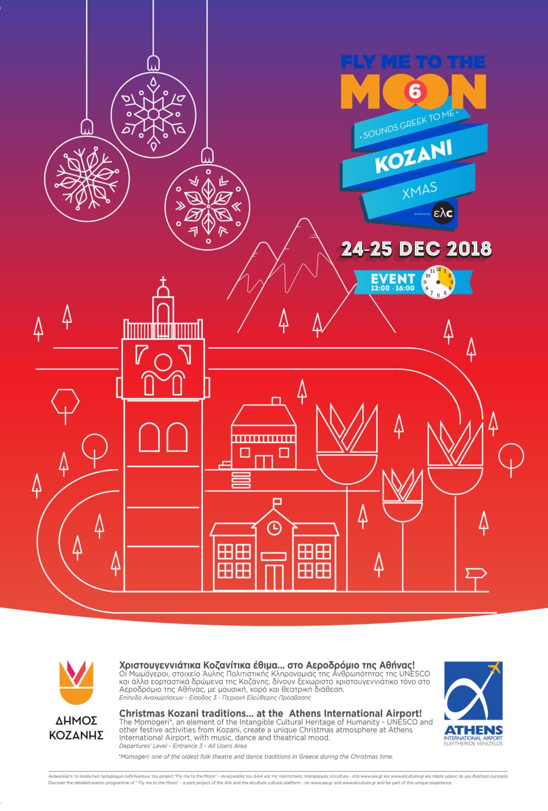 Με πρωταγωνιστές τους Μωμόγερους -στοιχείο Άυλης Πολιτιστικής Κληρονομιάς της Ανθρωπότητας της UNESCO- εορταστικά δρώμενα της Κοζάνης θα δώσουν ξεχωριστό χριστουγεννιάτικο τόνο στο αεροδρόμιο της Αθήνας. Οι ταξιδιώτες, αλλά και οι επισκέπτες που θα βρεθούν στο Διεθνή Αερολιμένα Αθηνών την παραμονή των Χριστουγέννων και ανήμερα, θα συναντήσουν μοναδικά τοπικά έθιμα, μουσική, θεατρική διάθεση, χορό και εκλεκτές κοζανίτικες συνταγές!